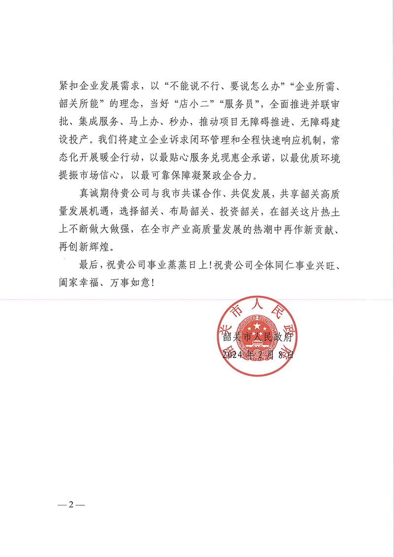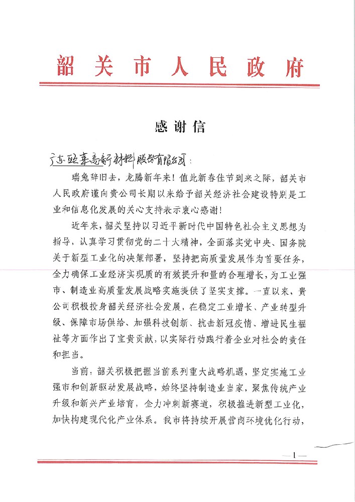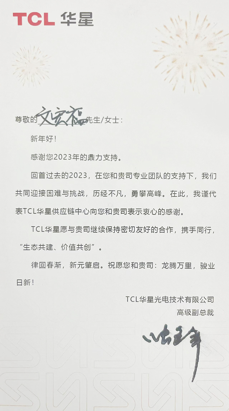 春节期间韶关市人民政府和重要客户华星光电给公司发来感谢信
